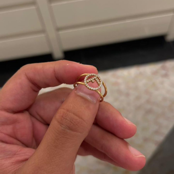 هذا الخاتم مصنوع من سبيكة APM صفراء ومطلي بالذهب عيار 18 قيراط. ومرصع بالزركونيا على شكل مكعبات باللون الأبيض.