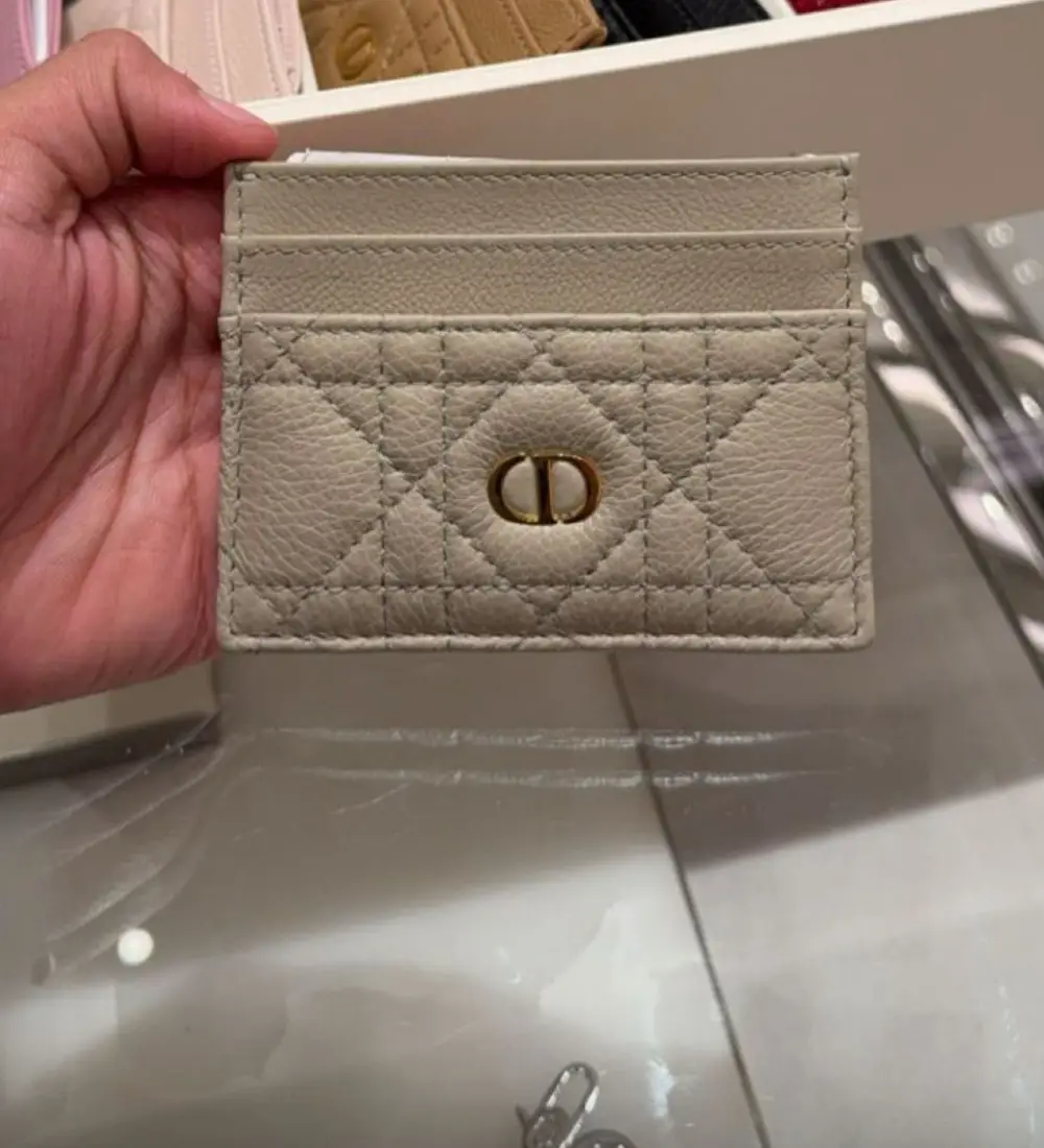 حاملة بطاقات بتصميم Dior Caro الفاخر، مصنوعة من جلد العجل الطري بنقشة الكنّاج الأيقونية، بلون وردي بودري ناعم يضيف لمسة راقية لأي إطلالة. مثالية لحمل بطاقاتك الأساسية بأناقة خفيفة لا تُقاوم