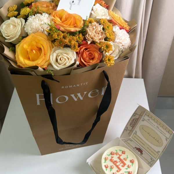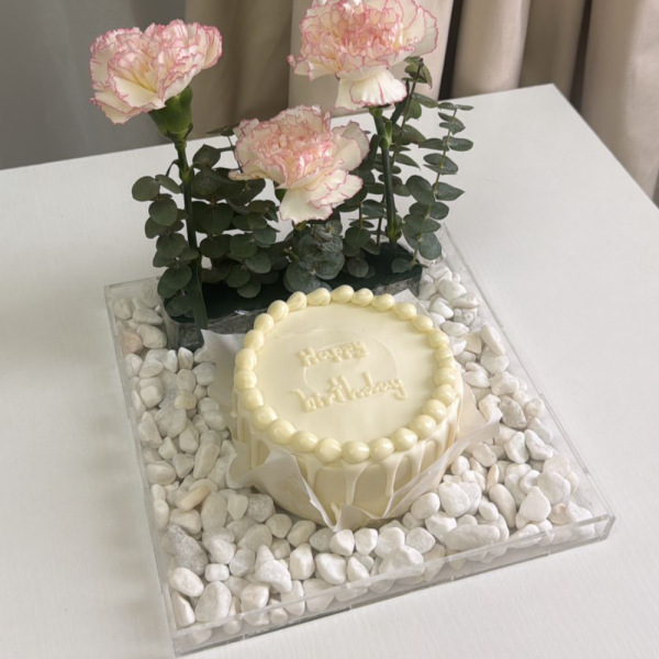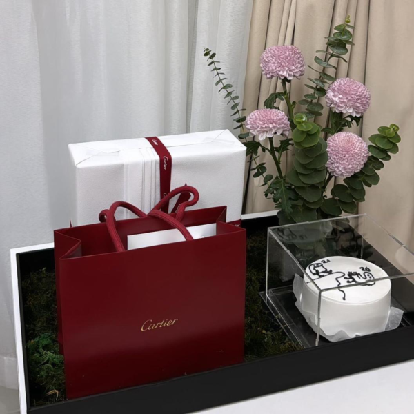 تنسّيق فاخر يضم بوك كارتير وعطر كارتير رجالي بتصميم أنيق، مع تنسيق ورد جذاب وكيكة مرتبة على قاعدة أكريليك شفافة. الكيكة مصممة بتفاصيل بسيطة تتماشى مع ألوان الورود، مما يعزز من جمال التقديم ويضفي فخامة على البكج، ليكون الهدية المثالية للرجل الأنيق.
