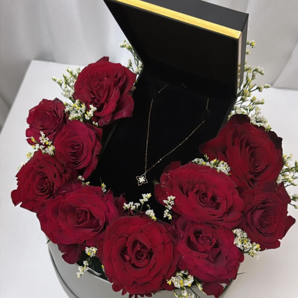 تنسيق خاتم من APM مع ورد الكارنيشن يتضمن خاتم فضي بتصميم عصري يوضع في علبة مخملية داكنة. يتم إرفاق ورد الكارنيشن الوردي ، مع تغليف فاخر في حقيبة أنيقة، مما يمنح الهدية لمسة راقية ومتكاملة.