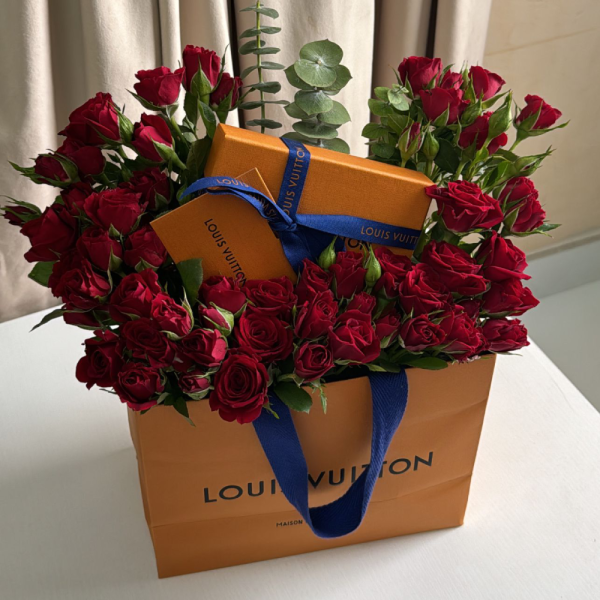 بوك لويس فيتون (LV) بتنسيق فخم ومميز يبرز جماليته مع ورود البيبي روز، مما يجعله هدية راقية ومثالية لأي مناسبة.