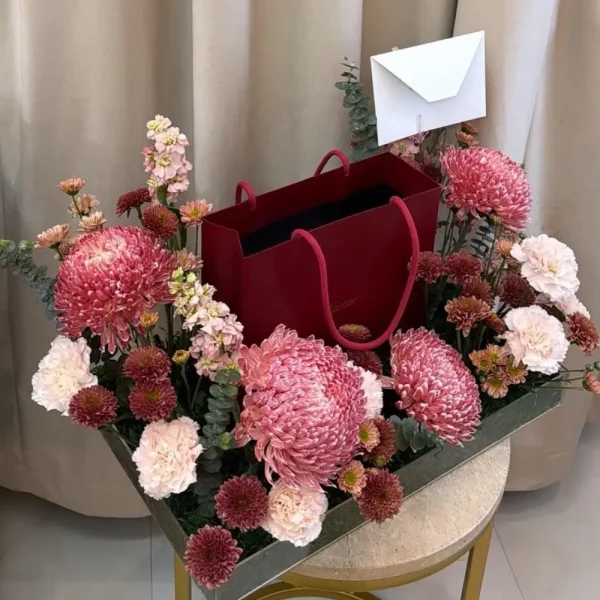 تنسيق هدية فاخر يجمع بين فخامة الورود البرتقالية وأناقة التفاصيل. اخترنا لكم باقة غنية بالورد الميني مع لمسات يوكاليبتوس وانتقينا الهدايا بعناية لتكون الهدية قطعة تفرّح القلب وتخلّد اللّحظة. تنسيق مثالي للمناسبات الخاصة ولصنع مفاجأة تليق بالشخص الغالي.