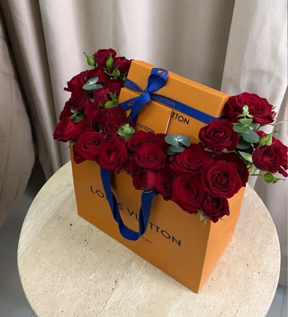 بوكس فاخر يجمع ورد أحمر طبيعي مع محفظة لويس فيتون داخل تنسيق أنيق
