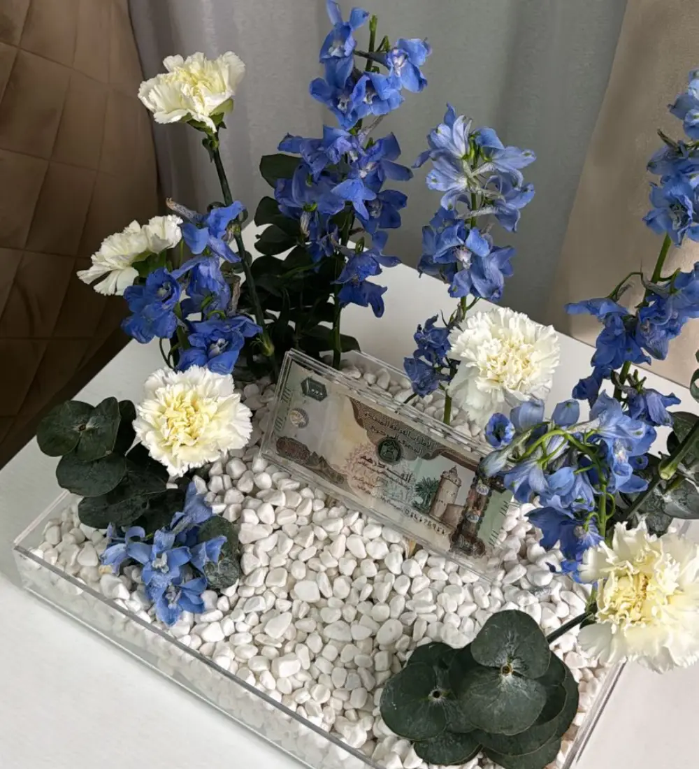 باقة فاخرة تجمع بين الورد الأحمر الجوري والقرنفل، بتنسيق أنيق يرمز للحب والقوة، ومُرفقة بنقود مرتبة بأسلوب عصري يعكس الفخامة والتميز. اختيار مثالي للإهداء في المناسبات الخاصة ولمن يقدّر الهدايا غير التقليدية ذات الطابع الراقي
