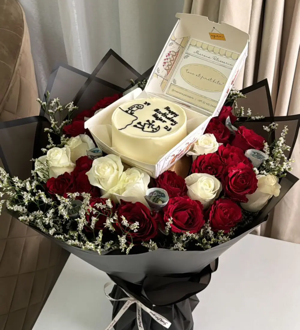 تتكون الهدية من كعكة شهية مصنوعة خصيصاً بكل حب، باقة ورد منتقاة بعناية لتعكس الجمال والأنوثة، وسماعات Apple AirPods 4 المتميزة بخاصية إلغاء الضوضاء النشط لتجربة استماع فريدة