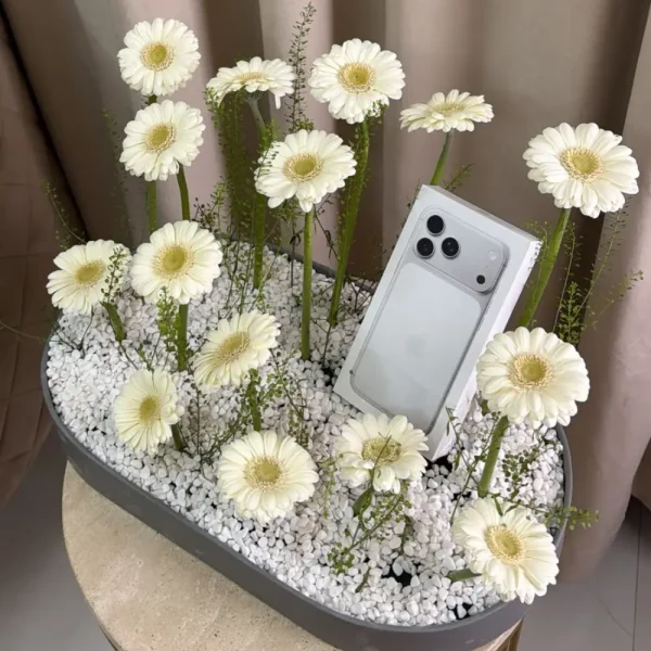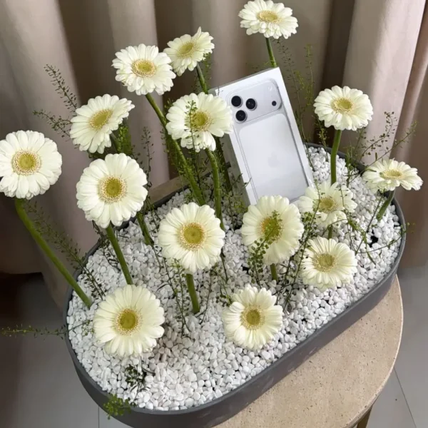 A sophisticated arrangement combining the beauty of white gerbera and soft green details on a base of white pebbles, elegantly showcasing the iPhone 17 Pro Max 256GB in a way that commands attention. A luxurious gift for any occasion that deserves a special touch.