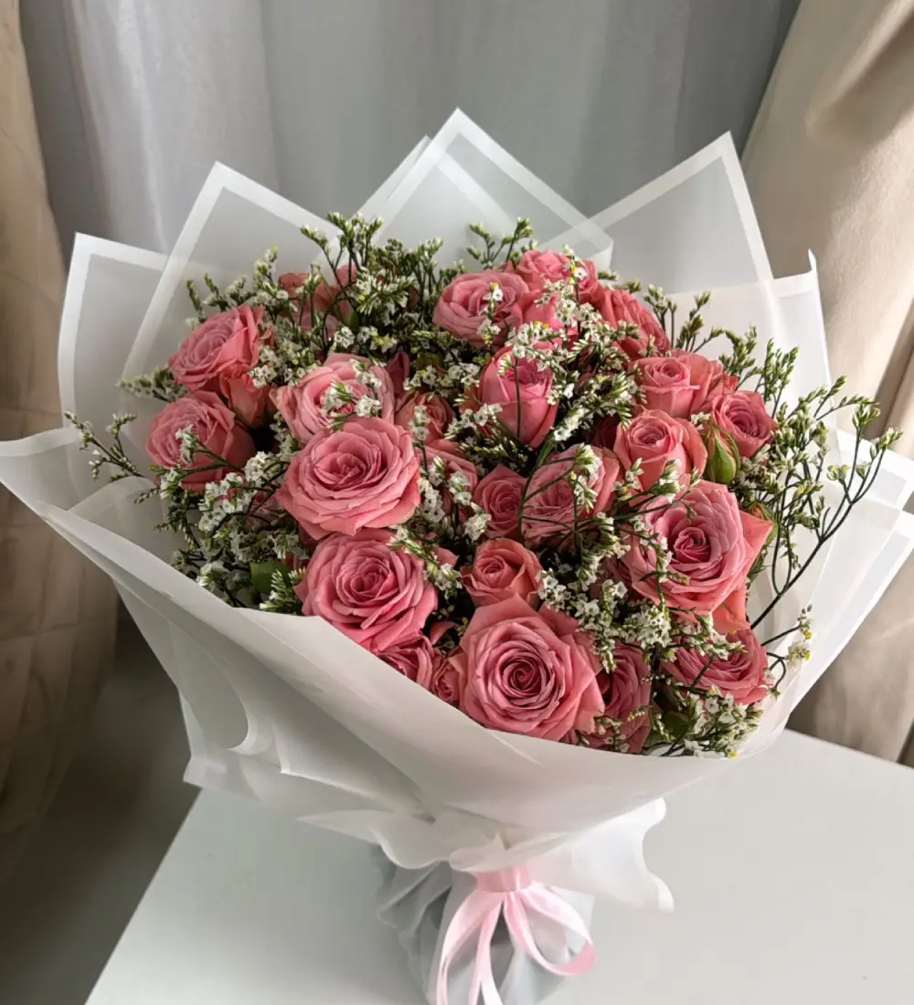 An elegant bouquet of roses, combining soft and deep shades of pink, wrapped in luxurious black packaging that highlights the roses' beauty and reflects a sophisticated and modern touch. A perfect choice to express love, appreciation, and sincere feelings on any occasion. 🌸