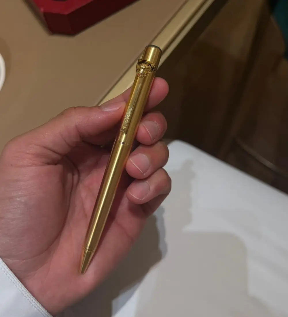 A ballpoint pen from the “Panthère de Cartier” collection, small size model. The body and cap are crafted from polished metal and finished in gold plating. The panthère nib is also made of polished metal, and the clip features a Clou de Paris motif. The details are finished in gold plating. The engraving is in Picasso marble (engraving takes 10 business days).