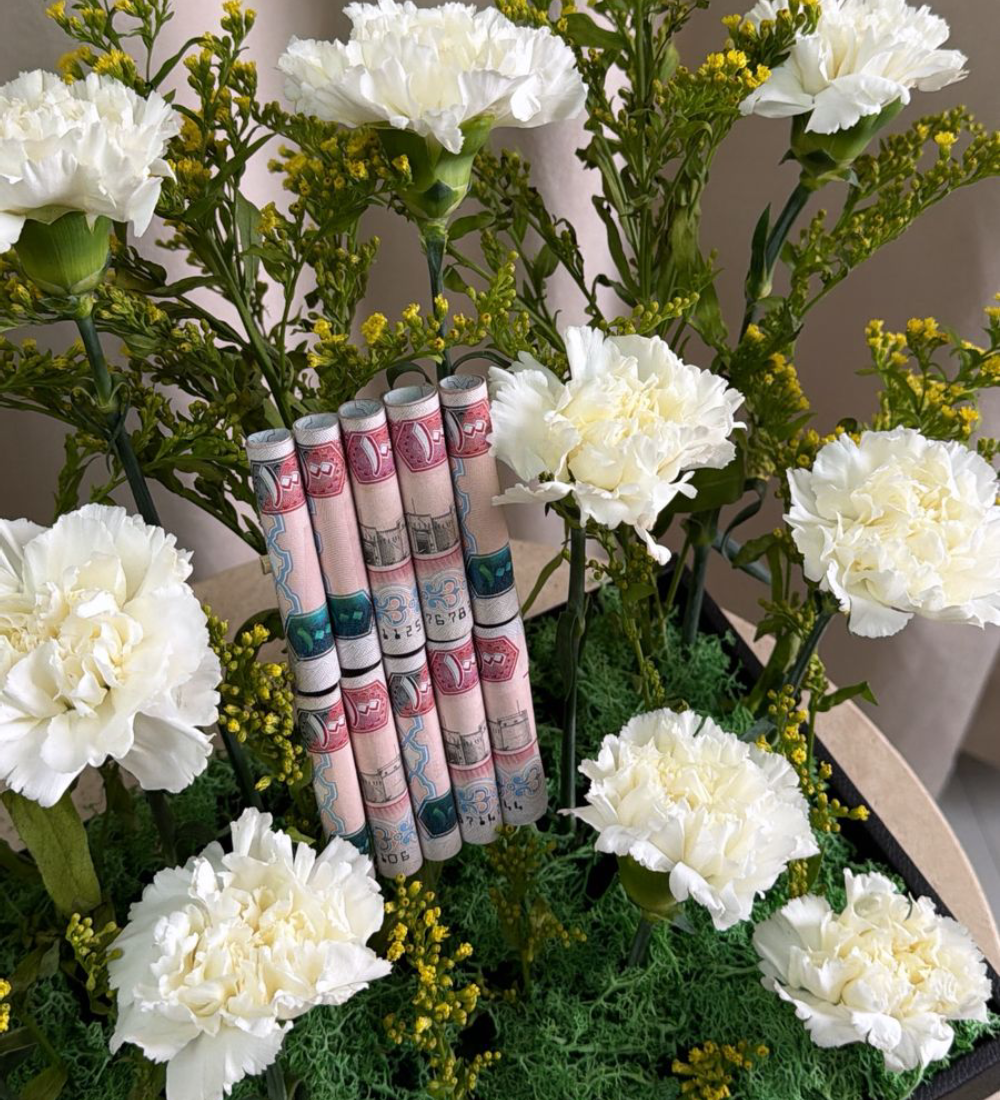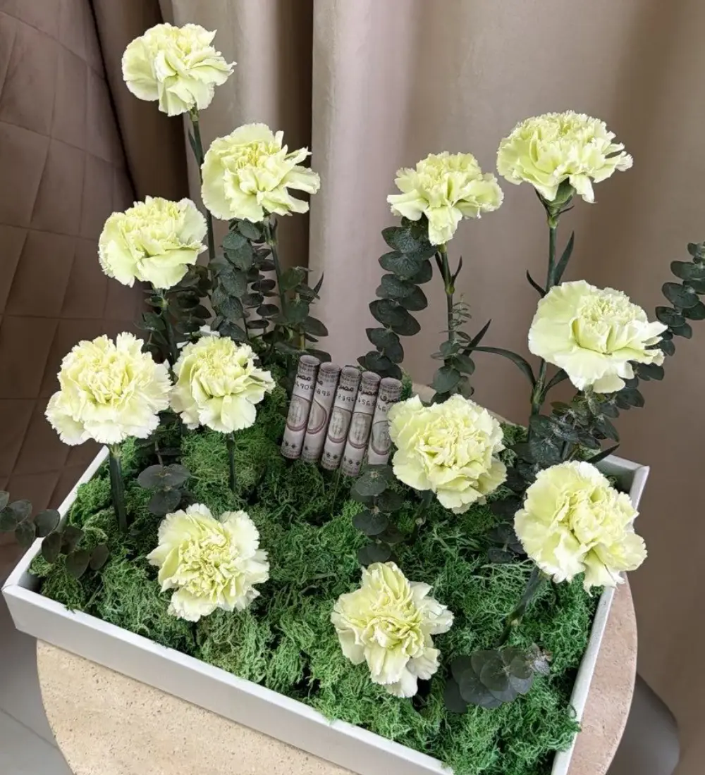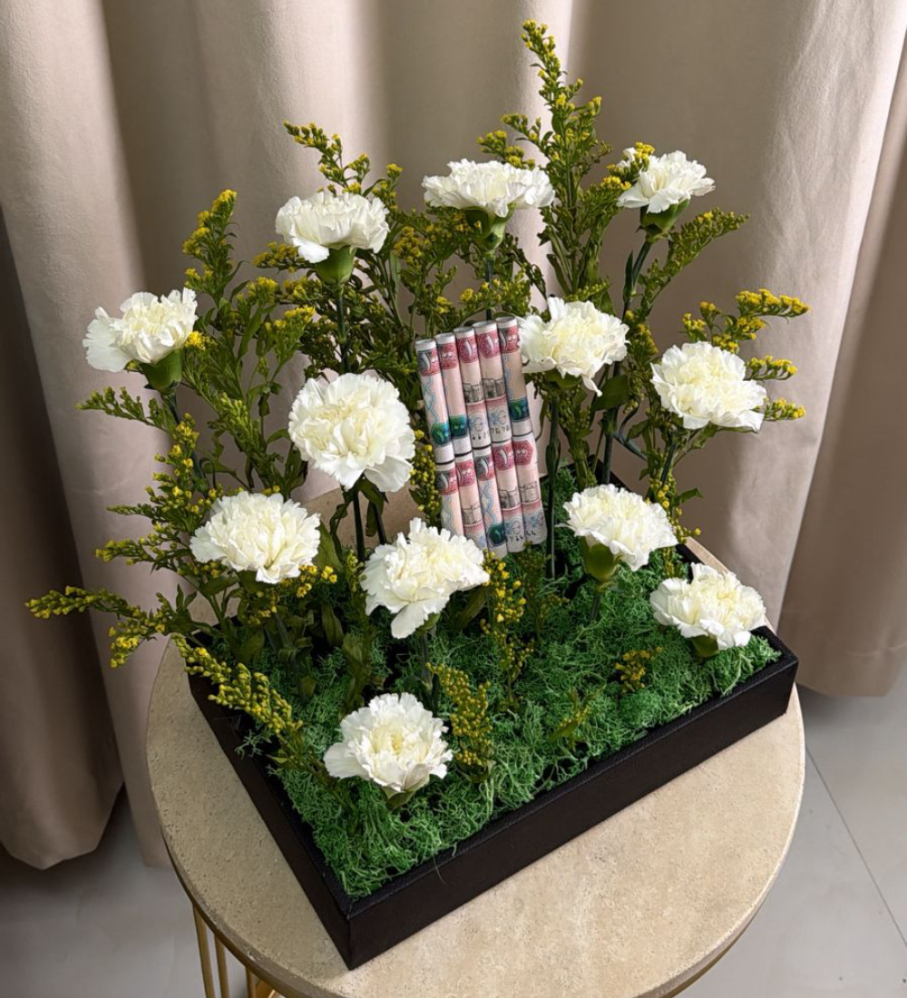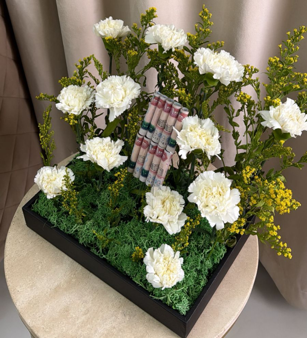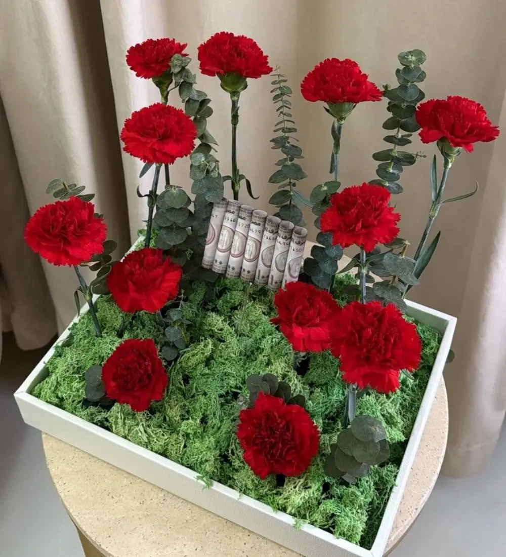 A luxurious bouquet combining red roses and carnations, elegantly arranged to symbolize love and strength, accompanied by banknotes arranged in a modern style that reflects luxury and distinction. An ideal gift choice for special occasions and for those who appreciate unique and sophisticated presents.