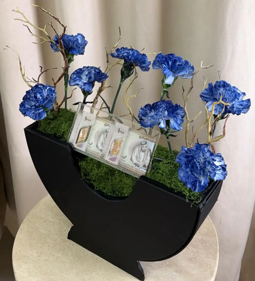 A luxurious arrangement of blue carnations within an elegant black base, adorned with natural touches and neatly arranged banknotes, presents a sophisticated gift that commands attention from the first glance.
