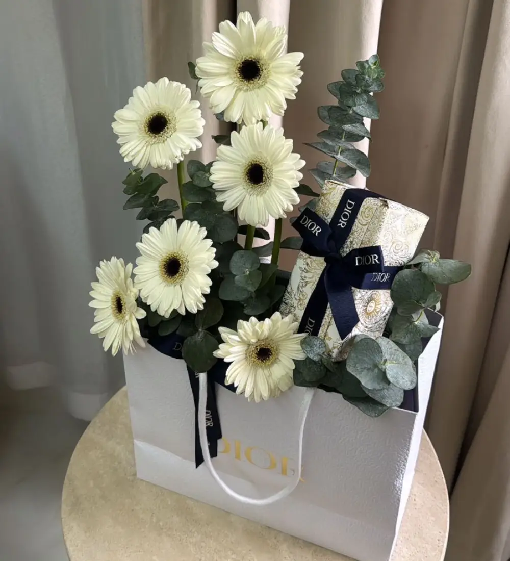 A luxurious package that blends softness and strength, featuring an elegant arrangement of natural white gerbera flowers with a touch of green, nestled within a Dior bag. It includes the Dior Sauvage Eau de Parfum for men, renowned for its long-lasting fragrance and captivating scent. An ideal gift that reflects refined taste and is perfect for special occasions, whether as a present or to impress someone special.
