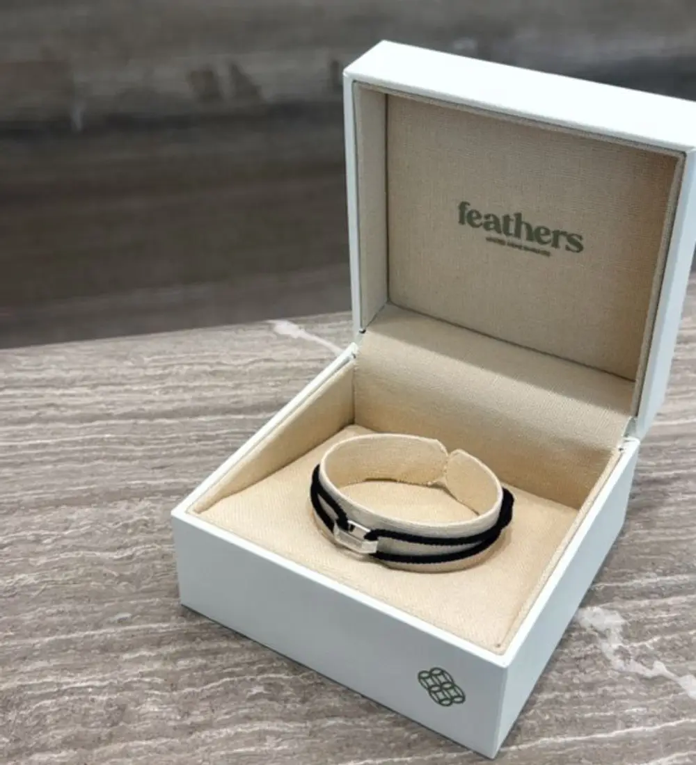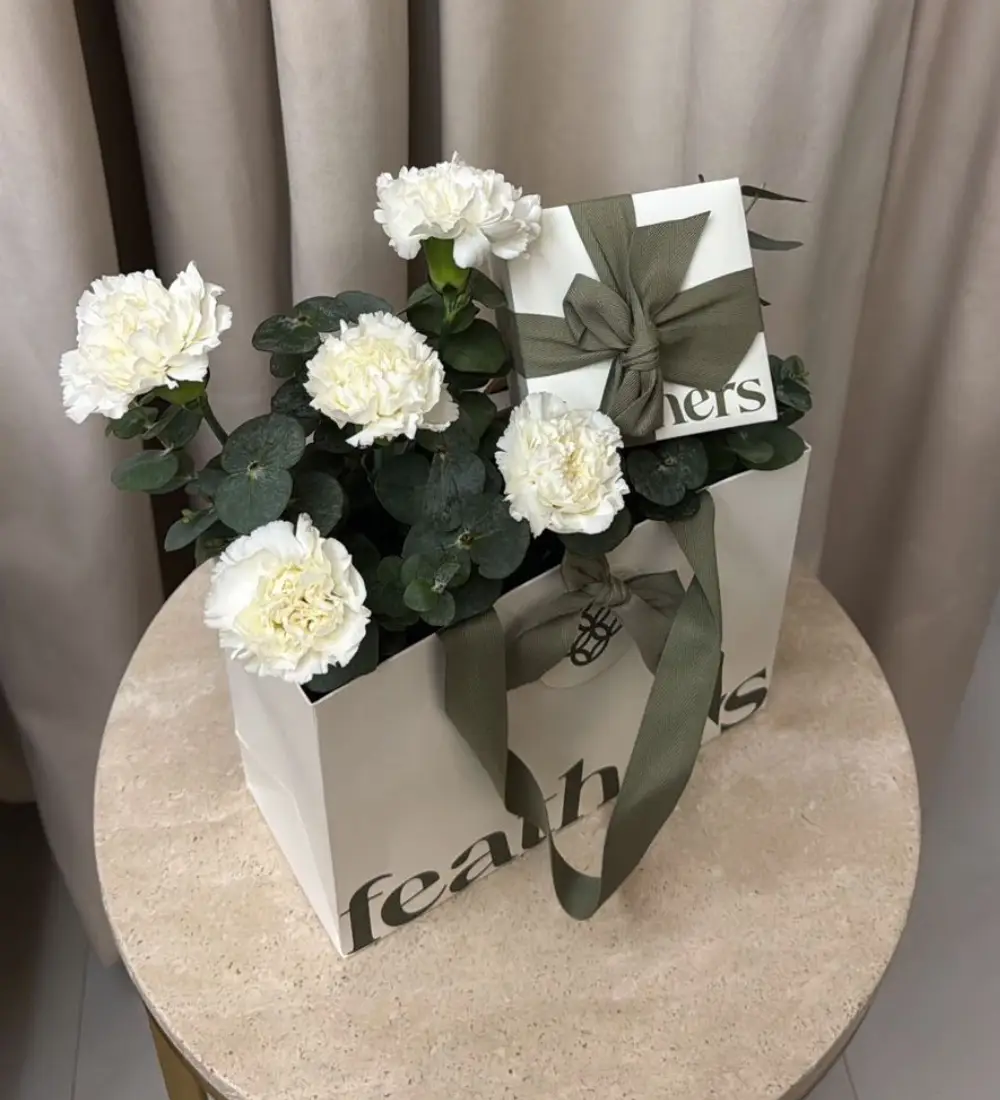 A luxurious package that combines simplicity and sophistication, featuring a delicate arrangement of natural white carnations with elegant green accents inside a Feathers bag, accompanied by a stylish bracelet with a modern design and clean lines, all presented in its own box. An ideal gift for those with discerning taste, it expresses refined elegance and is suitable for all special occasions.