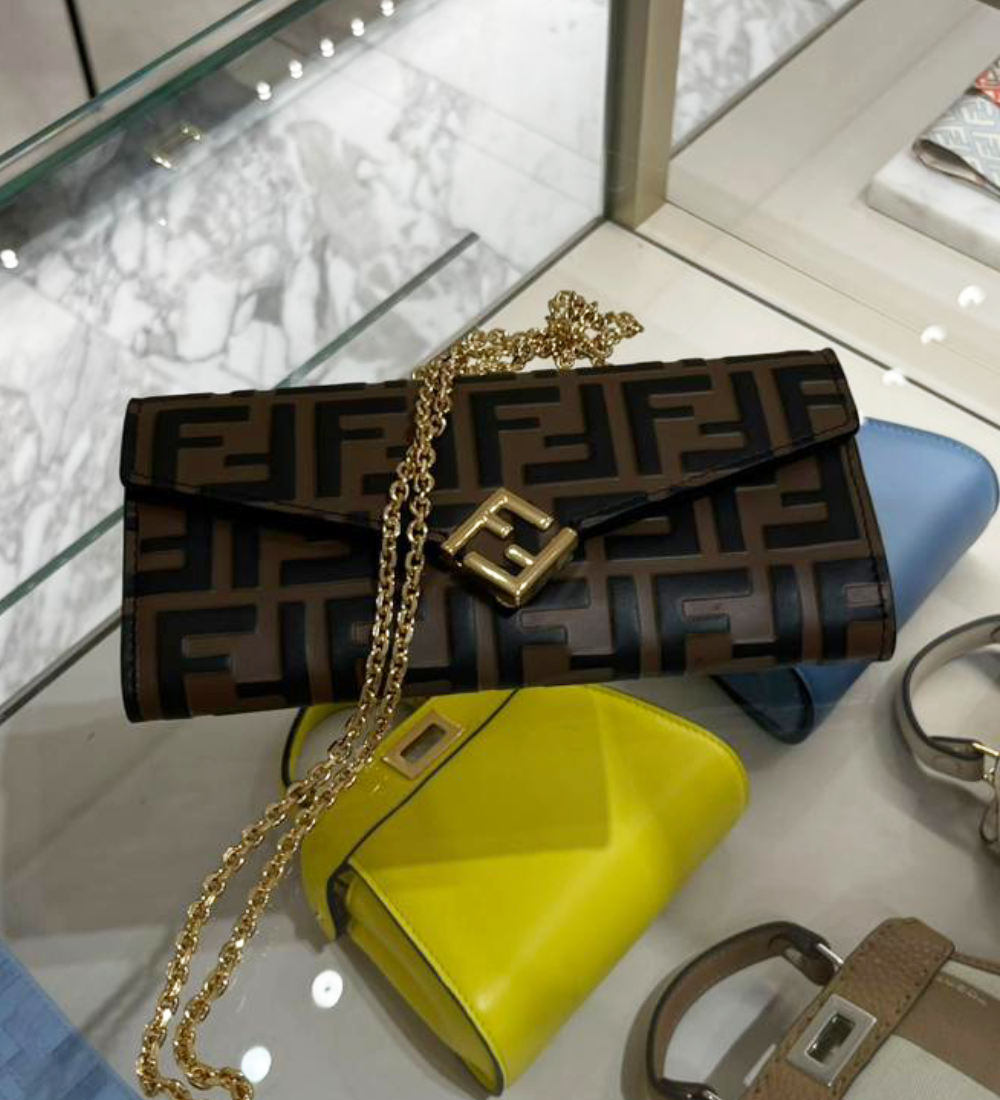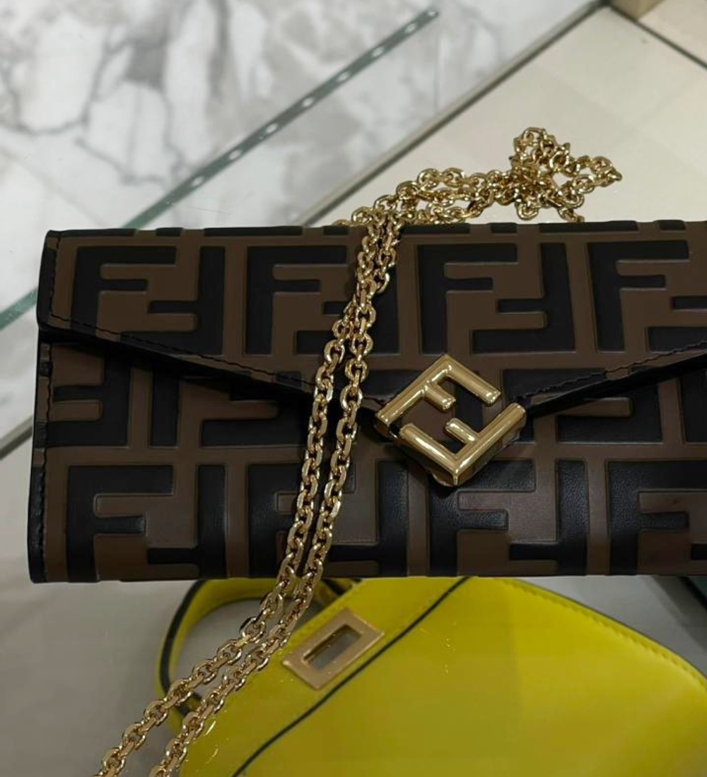 Small Baguette wallet with FF slot and clip. Interior features six card slots.