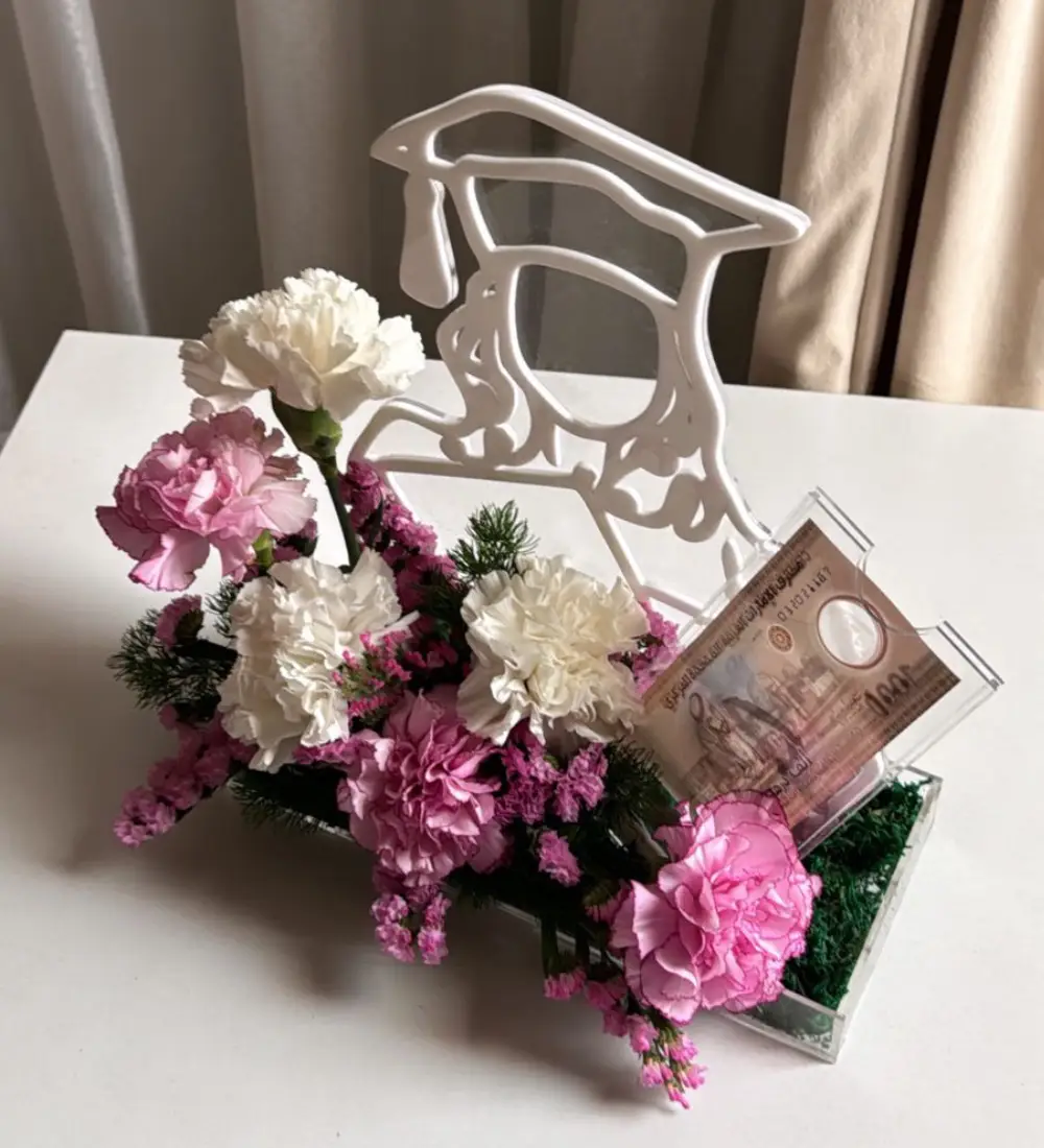 A luxurious bouquet of roses, elegantly arranged to combine red and white roses with a delicate touch of pink blossoms, wrapped in stylish pink paper and tied with a soft ribbon. Its beauty is further enhanced by small gift details that add a touch of thoughtfulness and refinement. A bouquet that expresses love and exquisite taste, perfect for special occasions and memorable gift-giving moments.