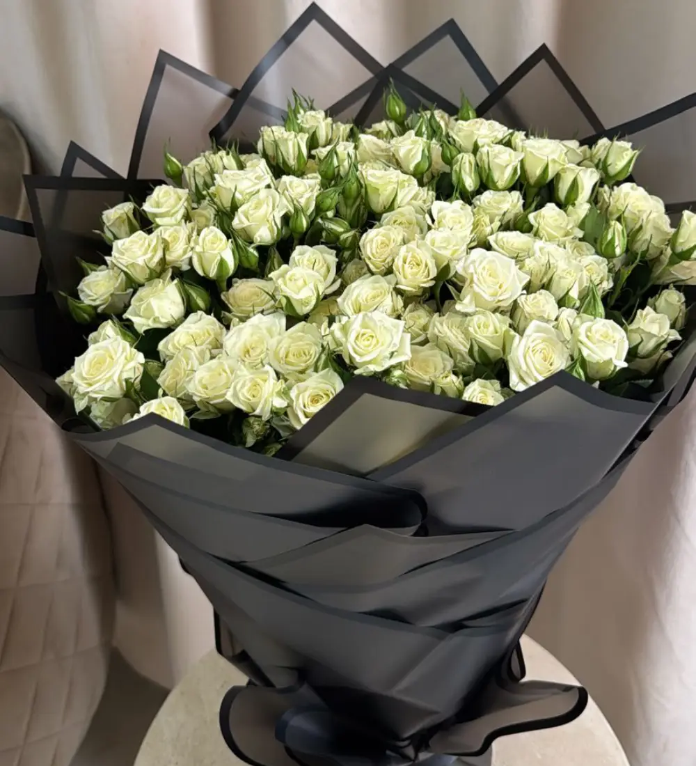 A luxurious arrangement featuring 20 sprigs of white roses in elegant black packaging, exuding sophistication and refinement.
