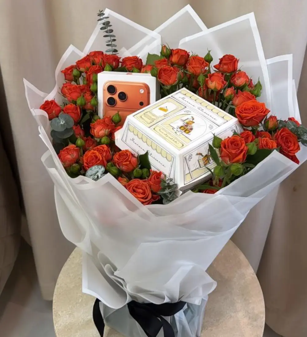 A luxurious bouquet of roses in shades of red and white, paired with a 512GB iPhone 17 Pro Max, combines modern elegance with cutting-edge technology. This sophisticated arrangement reflects luxury and meticulous attention to detail, making it an ideal gift for special occasions, where beauty meets high performance in one unforgettable present.
