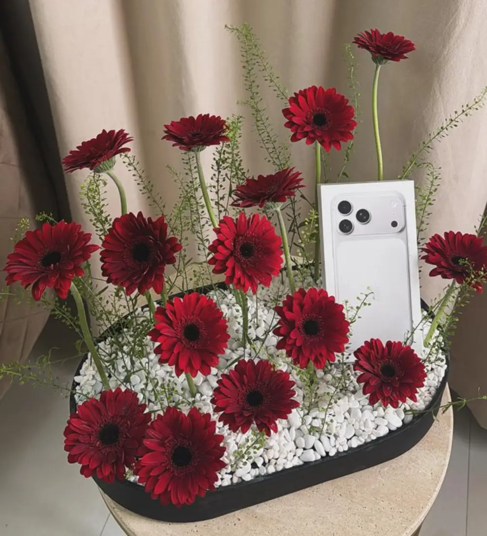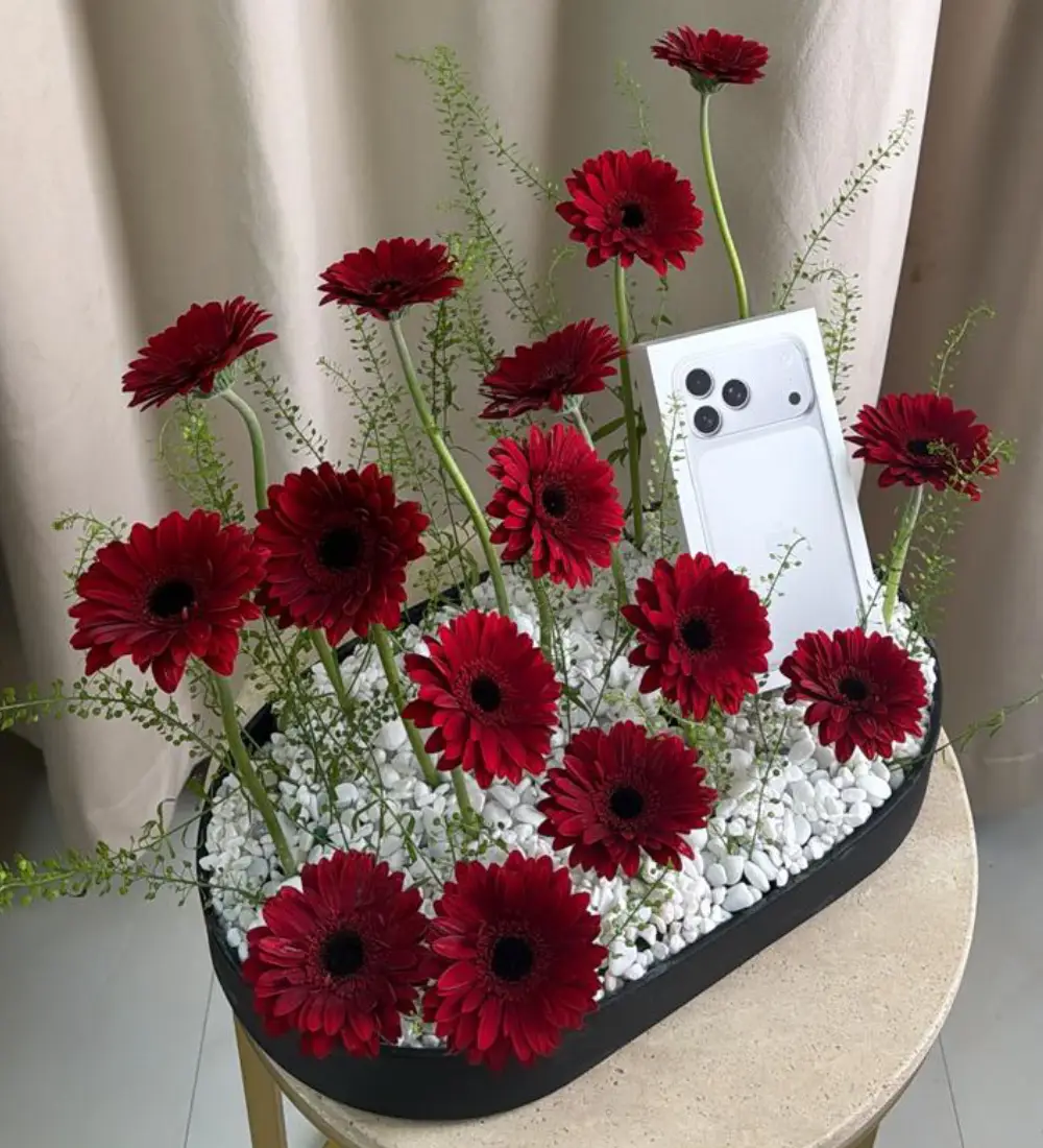 A sophisticated arrangement combining the beauty of red gerberas with soft green details on a base of white pebbles, elegantly showcasing the 256GB iPhone 17 Pro Max. A luxurious gift for any occasion that deserves a special touch.