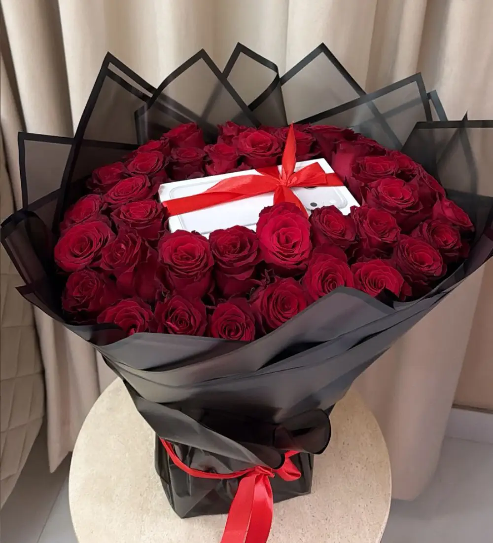 A luxurious arrangement combining the charm of natural roses with the allure of a sophisticated Apple gift. A simple yet elegant design, perfect for special occasions, reflecting refined taste in every detail. 🌸✨