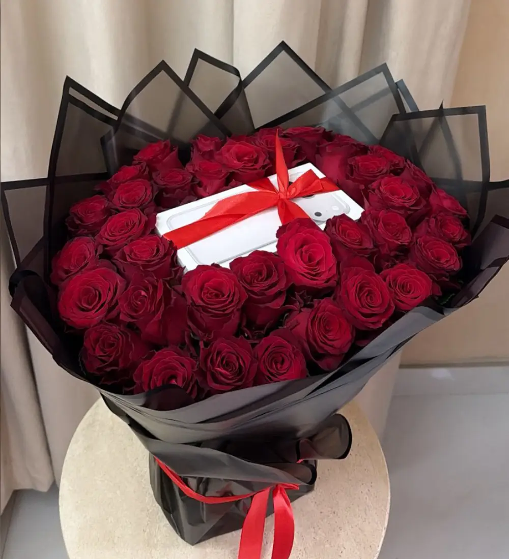 A luxurious bouquet of red roses arranged in an elegant circular pattern, expressing love and care in the most exquisite way. At its center is a carefully wrapped iPhone 17 Pro Max (256GB), making it a perfect gift that combines romance and luxury—ideal for special occasions and for that special someone who deserves the very best.