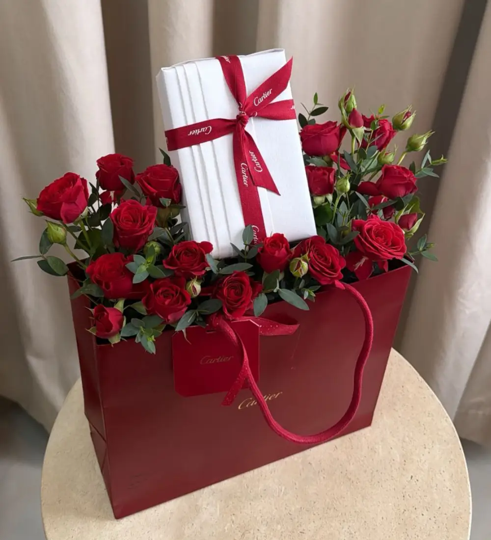 A luxurious package combining romance and elegance, featuring a carefully arranged bouquet of fresh red roses inside a sophisticated bag, along with a black men’s wallet with a modern design and elegant pattern that reflects classic taste. An ideal gift for special occasions, it blends luxury and practicality, leaving a lasting impression.