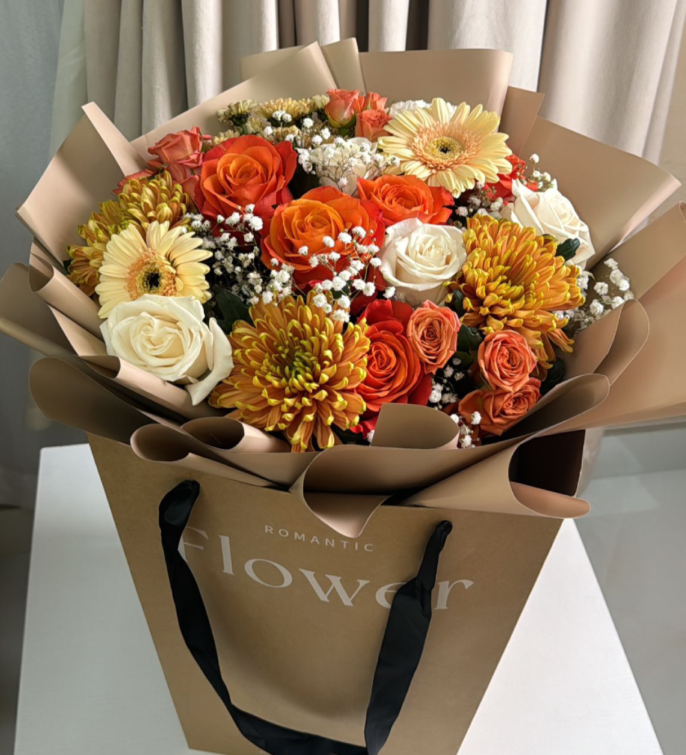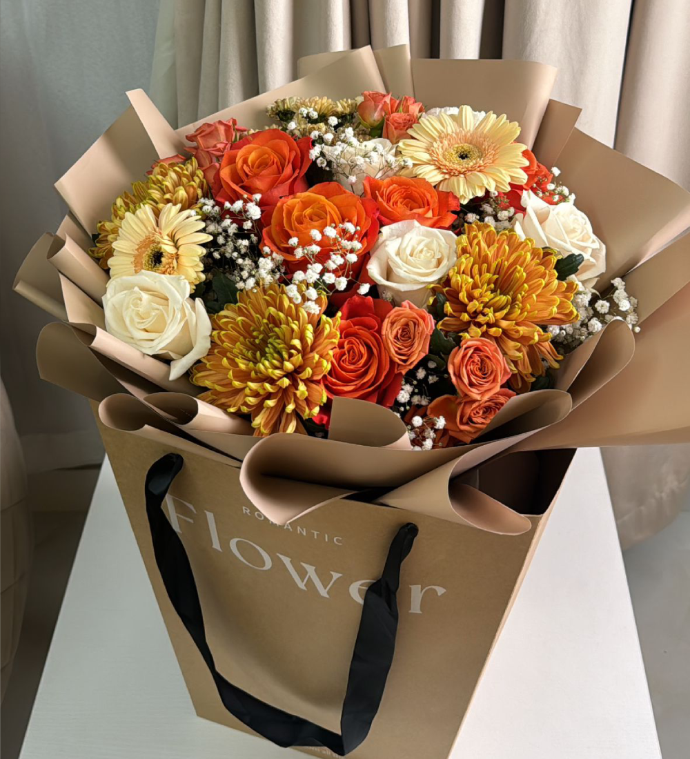 A sophisticated orange bouquet that combines white roses with distinctive orange shades. It contains a variety of roses such as orange roses, light white baby roses, and orange chrysanthemums with deep green shades.
