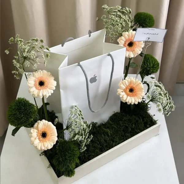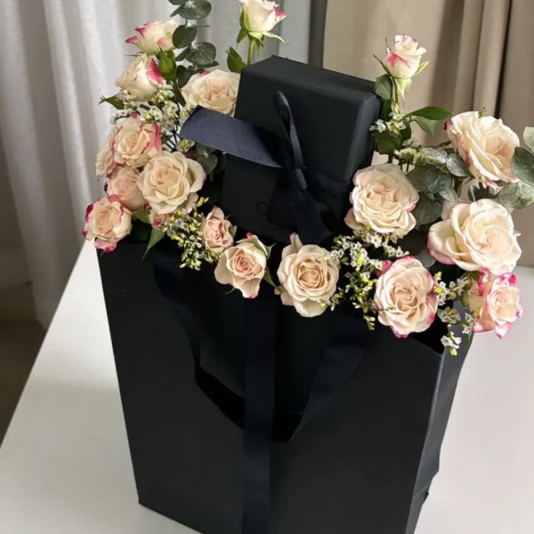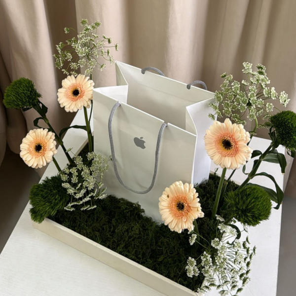 A luxurious arrangement combining the charm of natural roses with the allure of a sophisticated Apple gift. A simple yet elegant design, perfect for special occasions, reflecting refined taste in every detail. 🌸✨