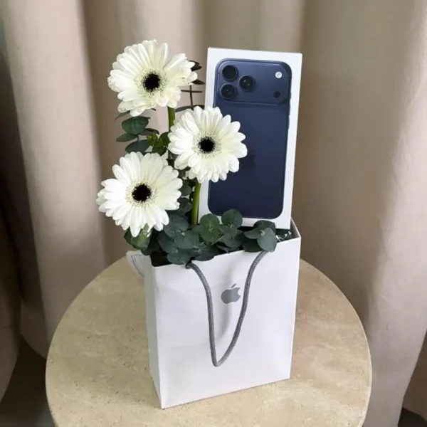 A delicate arrangement inside the Apple case combines the beauty of white gerbera with touches of eucalyptus, showcasing the iPhone gift in an elegant and distinctive way. A sophisticated gift that lingers in the memory at first glance.