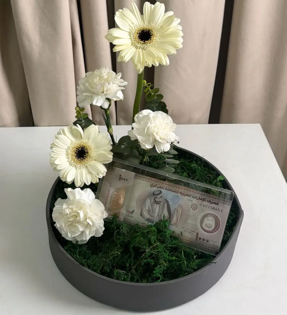 A luxurious arrangement of blue carnations within an elegant black base, adorned with natural touches and neatly arranged banknotes, presents a sophisticated gift that commands attention from the first glance.