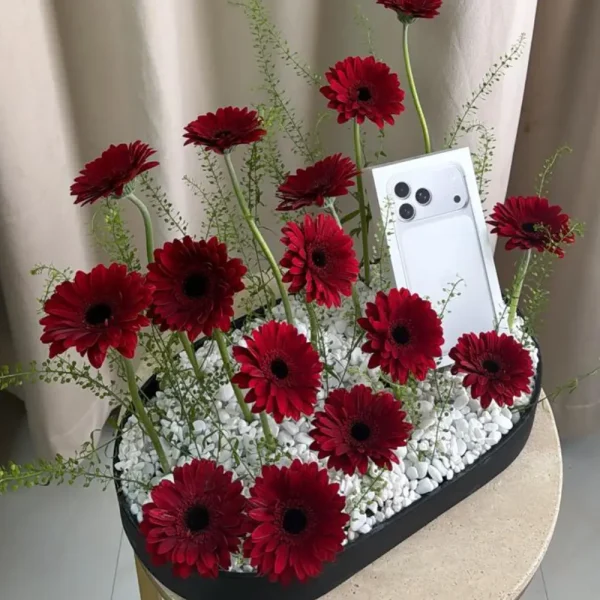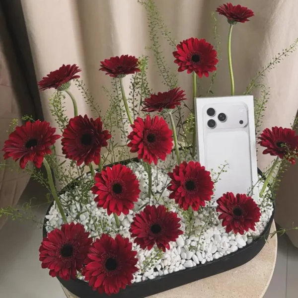 A sophisticated arrangement combining the beauty of red gerberas with soft green details on a base of white pebbles, elegantly showcasing the 256GB iPhone 17 Pro Max. A luxurious gift for any occasion that deserves a special touch.