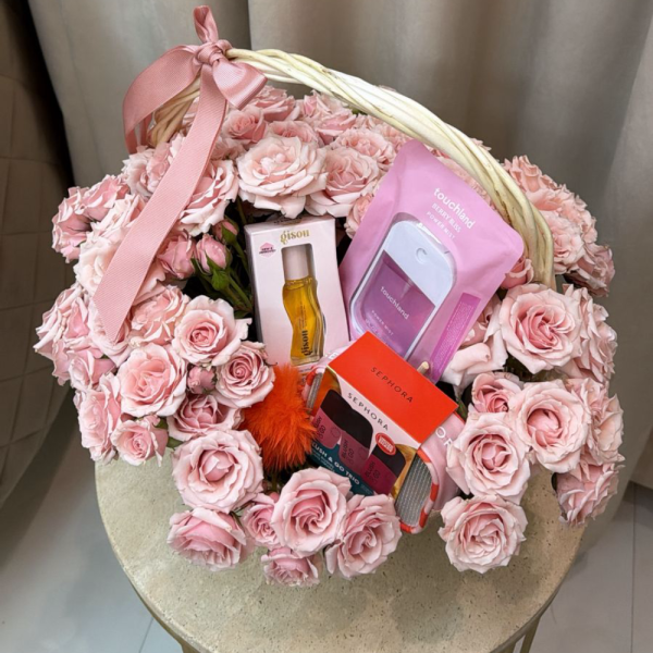 An elegant basket filled with natural rosy roses in calming pink shades, tastefully coordinated with selected care and beauty products.